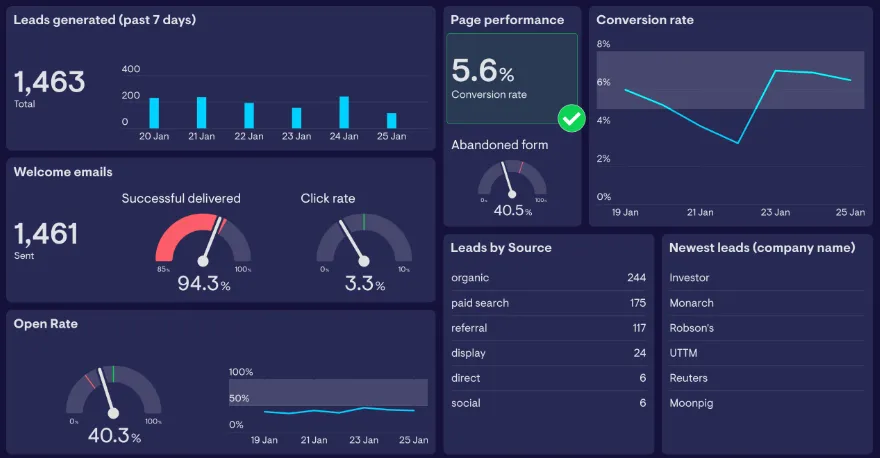 Page performance showed a strong 5.6% conversion rate, with leads coming from multiple sources — organic search (244), paid ads (175), and referrals (117).